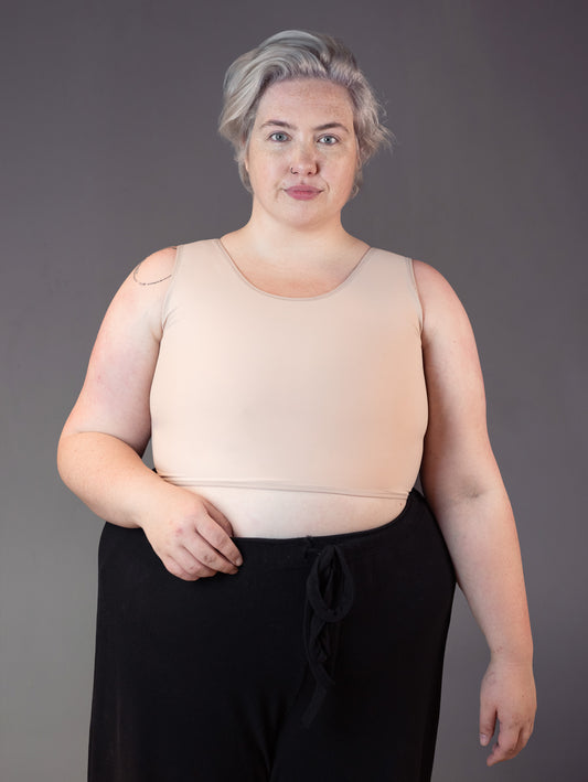 A binder, also known as a chest binder, FtM binder, binder bra, trans binder, or breast binder, is a piece of shaping underwear which is used to effectively and painlessly flatten the chest. Binders, like an undershirt or top, are often made of elastic material and fit tightly around the upper body. It spreads the breast mass and pushes them flat against the chest. You can use a binder for various reasons: you identify as trans, nonbinary, gender fluid, genderqueer, you want to look less feminine as a trans man or transgender person, you do cosplay or cross-dressing, but also for theater actors a chest binder can offer a solution for creating a character with a more masculine look. Note that chest binding is not without health risks!