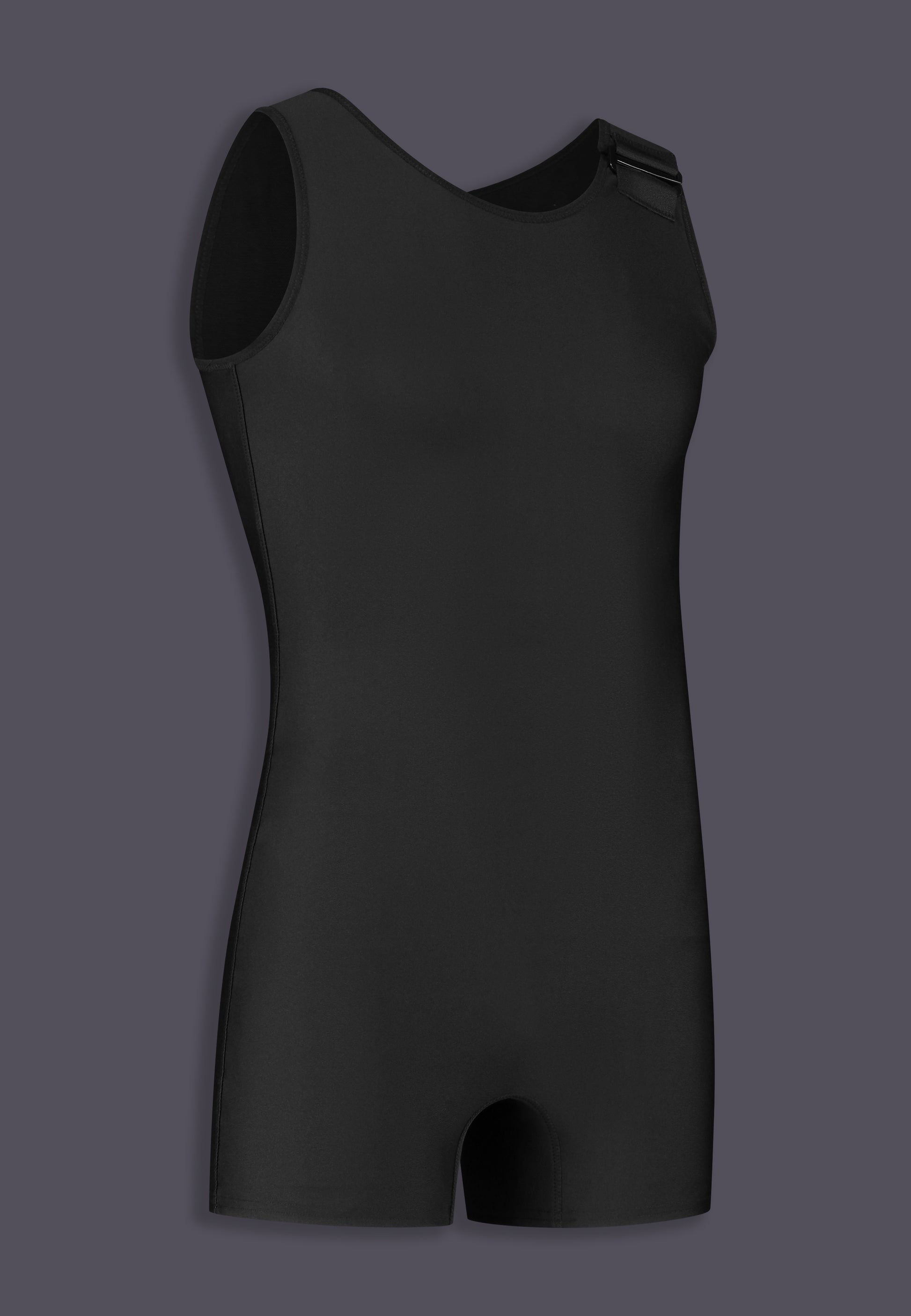 The sturdy hook detail is designed for easy wearing: it opens up the swimsuit so you can easily step into it. This makes it both practical and comfortable. Please note: the fit might be less ideal for people with very wide hips, as stepping in can be more difficult. The Swimsuit Binder features broad shoulder straps and short legs for a streamlined figure. While there is no extra pouch for a penis prosthetic, the suit can be combined with the harness ring or foam penis padding.