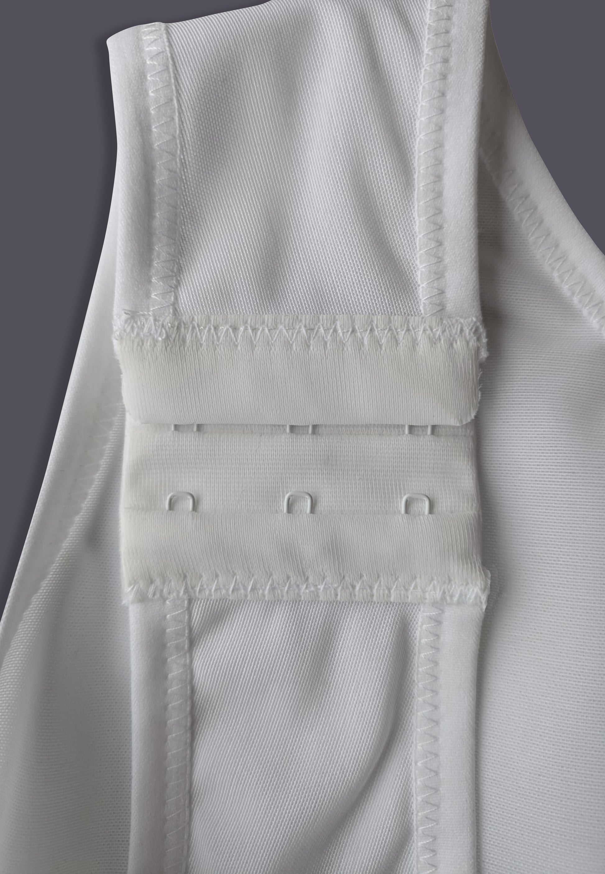 El Medical Binder tiene un corte corto y un cierre de corchete en la parte delantera. Las correas de los hombros también tienen cierre de gancho y ojal. Esto garantiza el ajuste más seguro después de una mastectomía.